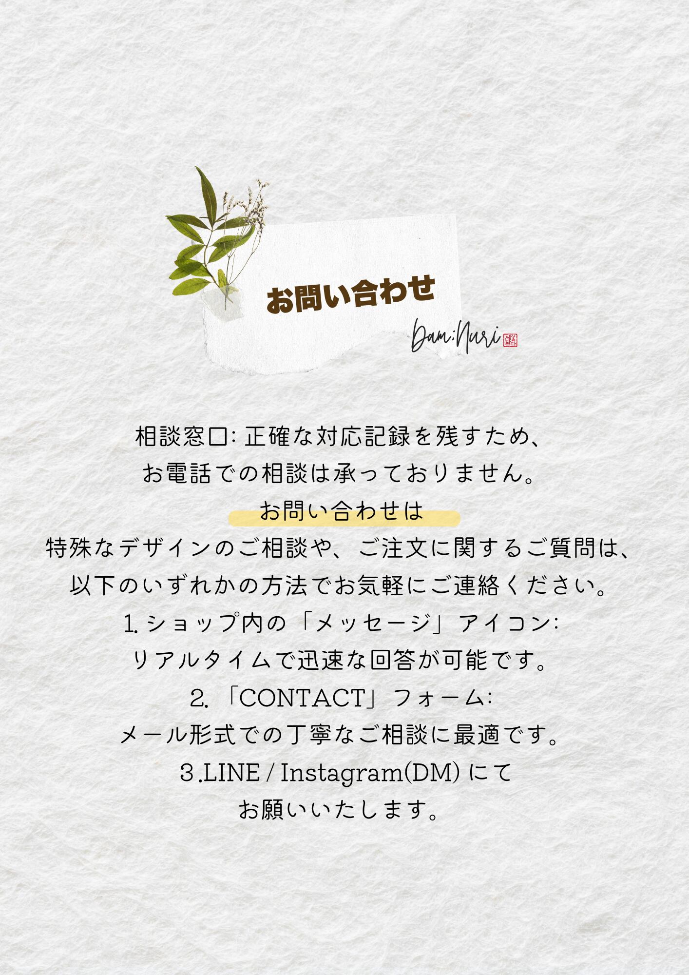 製作期間、配送方法、およびハンドメイド製品の特性に関する詳細な案内を記載しております。