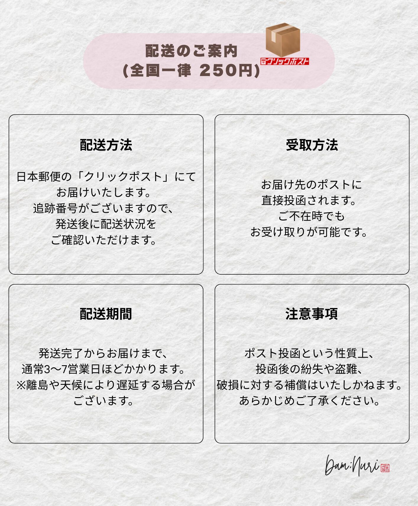 配送方法: クリックポスト(日本郵便)にて発送いたします。発送後、通常2〜5日程度でお手元に届きます。